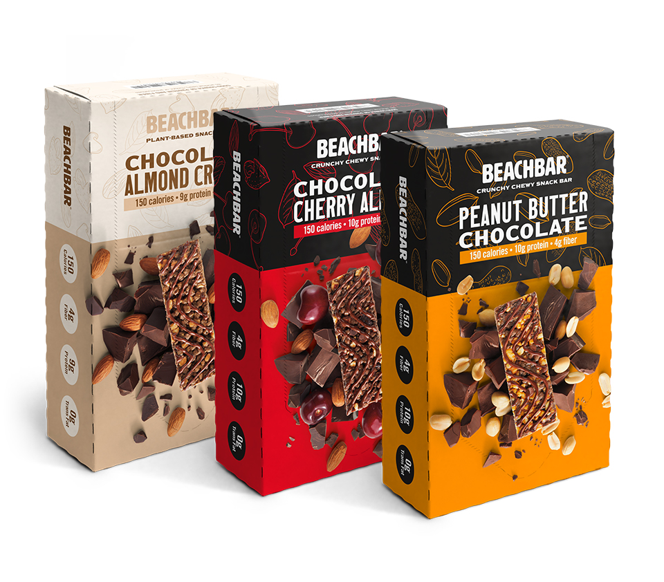 BEACHBAR combines crunchy protein crisps, nut pieces, chocolate chips, creamy nut butters, and fruit chunks (in the Chocolate Cherry Almond flavor only) to deliver delicious, satisfying goodness in every bite.